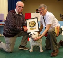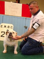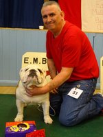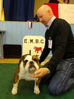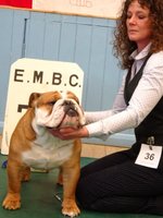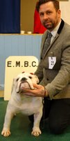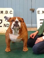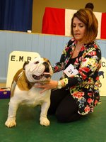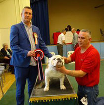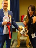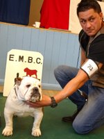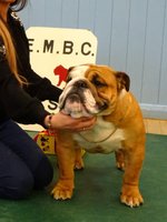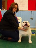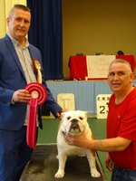 JD (4,1) - 1 Manders, Erimusbulls Mannion, r/w lovely flat skull with fine wrinkle, round open clear dark eye, nice rose ears, open nostrils, well filled foreface with nice turn of true jaw. Super front with good brisket and good bone to tight feet. Nice neck with topline held on the move, good tail and angulation, moved very well, presented in pristine condition. BIS. 2 Evison's Kikuchi Storm Trooper, w, another nice dog unlucky to meet 1st. Lovely head properties with good ears and eyes, good bone with nice topline and angulation,moved well.