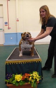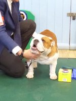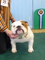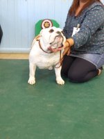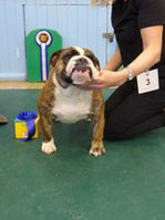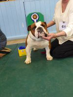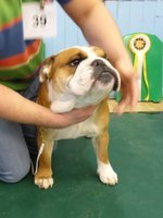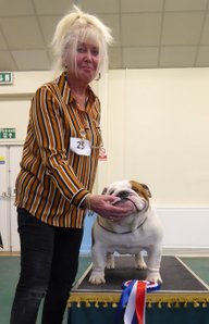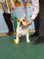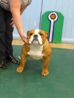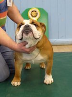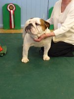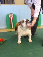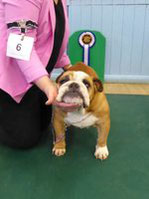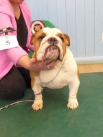 OB (5,1) - 1st. Williams' Willsmere Samantha - Well constructed white bitch. A good honest bulldog with great construction and topline and good tail. Tacked on shoulders with good bone and wide front with adequate depth (handler tended to stand her too wide in front, making her lean sideways and look unbalanced). Pleasing head with clear dark eyes and neat ears. Moved very well. 2nd. Ashton & Dodwell's Asharlo Gypsy Rose - Very close decision between (1) and (2). Brindle/white bitch with super front - good width and depth - and good feet. Lovely body shape with correct shoulders, good spring of rib and correct rise, leading to good tail. Good head shape with dark eyes, flat skull and neat correctly placed ears. 3rd. Davies' Shiloh Disco Dancer Kismond JW