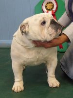 PGB (2,1) - 1st. Dean, Hawkbull Dottie Bullmarina - r/w wide open nostrils, clear eyes, good turn and width of true jaw. Flat skull with fine wrinkle, well placed rose ears, square front, enough rib, nice topline leading to a free tail, good rear angulation, moved ok.
