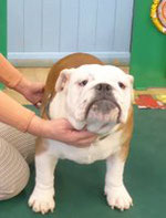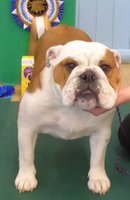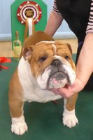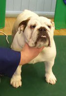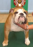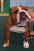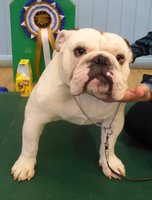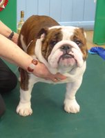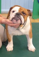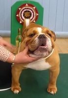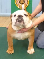 R/W good width of skull, clear dark eyes, open nostrils, neat rose ears, straight front, short cobby body with enough neck, good rear, moved ok but a bit unsettled.
