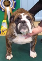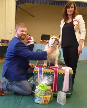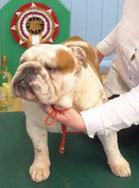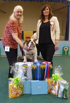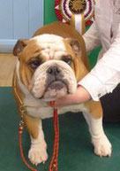 Lovely balanced B/W, lovely flat skull, good jaw and width, clear dark eye, open nostrils, well placed neat rose ears, correct straight front, tight cat feet, lovely barrel of rib, enough neck, short cobby body with good rear, moved well, has a bright future. BIS, BPIS.
