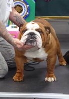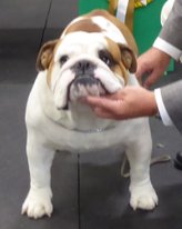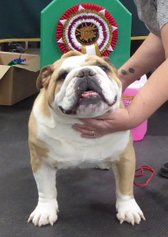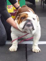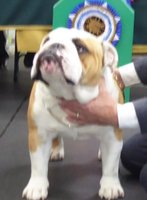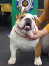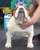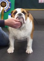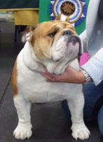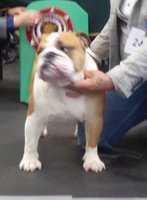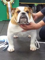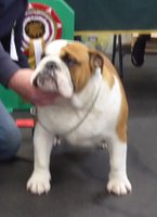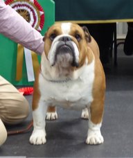 2nd-Sanson's, Pique Oliver Twist-This flashy standard r/w pied dog has the most wonderful brick shaped head with fine wrinkle, wide flat skull, dark round clear eyes and big broad black nose with open nostrils. His jaw is very wide with great upsweep helping form a perfect layback. His front is square and strong with massive bone to strong pasterns and lovely well knuckled tight feet. Well let down brisket and ample rib, tuck up to a light well angulated rear end gives him a correct pear shaped body. He has a thick arch of neck to correct topline and lovely loose healthy tail. He has wonderful movement front and rear and has that classic bulldog roll. I was very happy to award him RDCC.