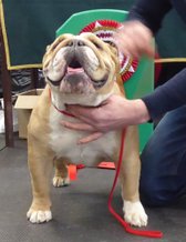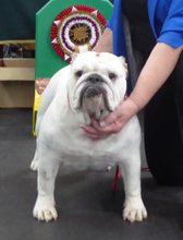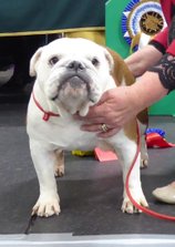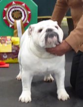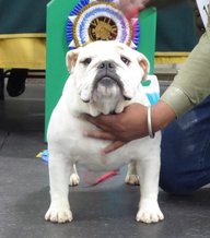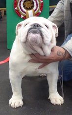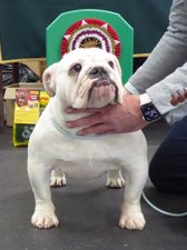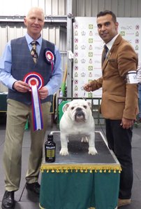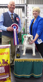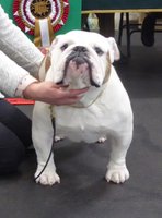 1st-Saxon's, Bagibeli Dancing Queen-I've admired this beautiful white girl since she was a puppy, it was a pleasure to go over her and she certainly didn't disappoint. Totally balanced and looks great from every angle, perfect pear shaped body with all the curves in the right places. Tacked on shoulders, strong bone and pasterns to tight knuckled feet. Her chest is wide with deep brisket and good spring of rib, lovely bottom line curving to good tuck up, great topline with correct roach curving gently over the loins. Her rear end is strong but light with good angulation, hocks well let down and healthy tail. She has good length and arch of neck and the most pleasing head with lots of virtues. The skull is wide and flat with lovely fine rose ears well positioned, eyes are round clear and dark set wide apart, level with stop and good distance from ears. Neat nose roll above a broad black nose with wide open nostrils and an immense upsweep of true jaw giving that stand off expression but retaining her femininity. With such a well put together body you just know her movement will be good and she glides around the ring moving her width at the front with light rear movement and the classic bulldog roll. I was delighted to award this beauty her first BCC and BOS.