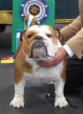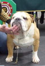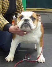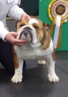 1st-Bannister's, Andlare Bobby Dazzler-Very appropriate name for this flashy eye-catching r/w pied boy of quality. Wonderful pear shaped body with tacked on shoulders, barrel rib, well let down brisket, square front with strong bone and pasterns to neat tight feet. Wonderful topline to well angulated rear end and healthy free tail. Pleasing brick shaped head with good width and depth of foreface, wide flat skull good ears, round clear very dark eyes set at right angle to furrow and level with stop. Lovely pigmentation, broad black nicely placed nose with wide open nostrils and a lovely wide true upsweep of jaw to complete the picture. Moved his width and has that lovely classic bulldog roll. Presented in tip top condition.