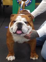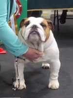 1st-Moody's, Shipshape Star Trooper Bulldurham-This gorgeous flashy r/w boy was very fidgety on the ramp but made up for it with his wonderful front and rear movement. He had a lovely strong finely wrinkled head with a very wide flat skull, fine rose ears positioned high at each corner. Round clear dark eyes set wide apart level with stop, broad black nose with wide open nostrils, the widest of jaws with lovely upsweep giving that stand off expression and forming a lovely layback. Well boned front with tacked on shoulder, good barrel, topline and tuck up to light rear end with healthy loose tail.